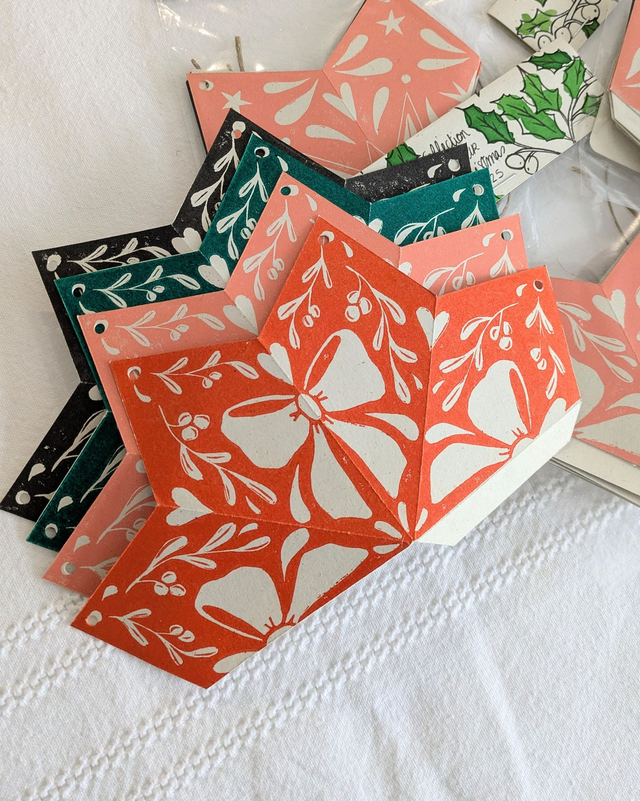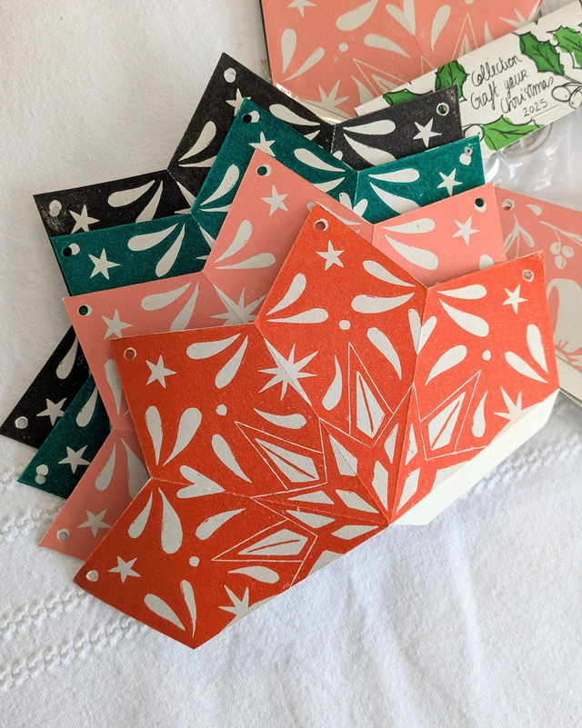 Les suspensions sont réalisées en linogravure, le lot contient 4 suspensions de 4 couleurs différentes, rouge, rose, vert et noir.
