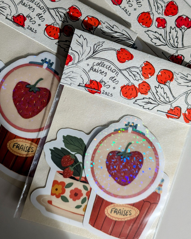La collection " Fraises des bois " contient trois stickers inspirés des motifs présents dans les trois aquarelles de la collection.