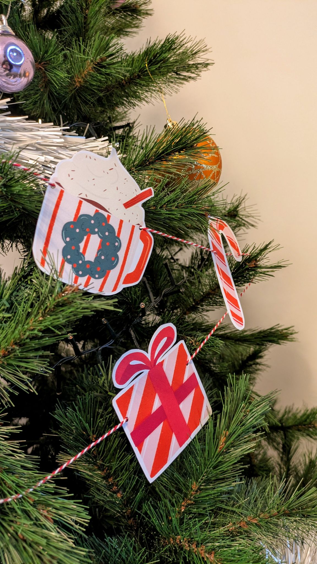La guirlande est composĂ©e de 7 motifs, bonhomme en pain d’épices, cadeau, sucre d’orge, chaussette, gui, houx et une tasse de chocolat chaud.